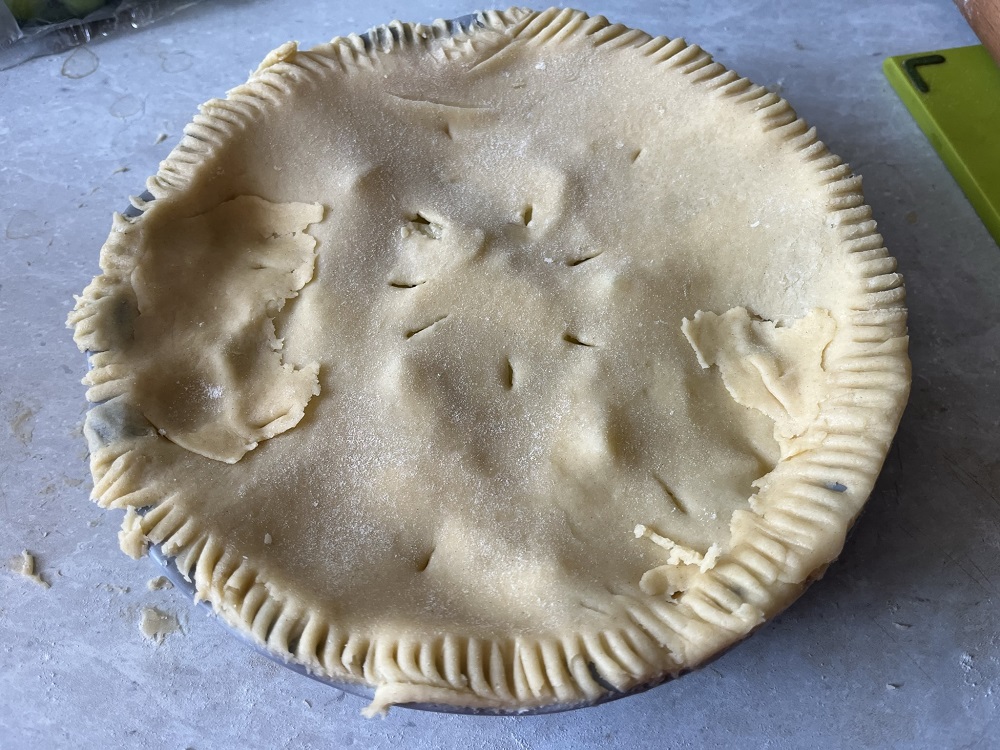 My first-round error was a lesson worth learning: I re-rolled my top lid pastry three times, which meant it ended up overworked. As soon as it hit the oven, it shrank and pulled away from the sides of the dish.